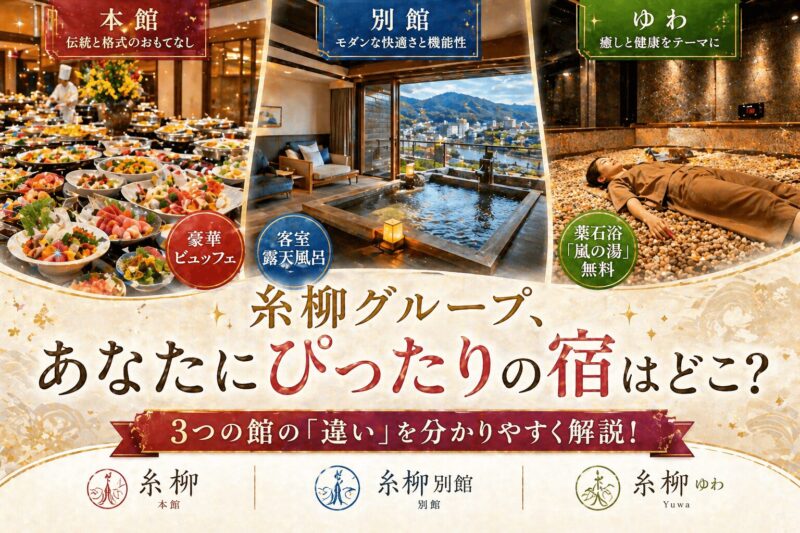 石和温泉「糸柳」グループの違いを徹底比較|本館・別館・ゆわの客室や食事・温泉の特徴まとめ トラベル・役立ち商品