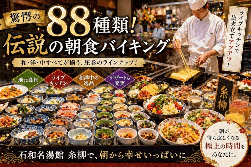• 88種の朝食バイキングと王道温泉なら→石和名湯館 糸柳(本館)