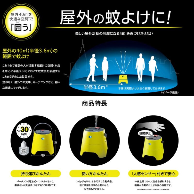 | KAKOI | コードレスで屋外利用に最適/火・煙なしで安全/半径3.6mをカバー/人感センサー付き | 薬液交換が必要/風の影響を受ける場合あり/価格がやや高め |